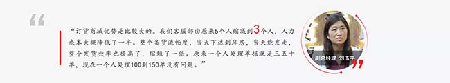 訂貨商城優(yōu)勢是比較大的。我們客服部由原來5個人縮減到3個人,人力成本大概降低了一半。整個備貨流暢度,當(dāng)天下達到庫房,當(dāng)天能發(fā)走,整個發(fā)貨效率也提高了,縮短了一倍。原來一個人處理單據(jù)就是三五十單,現(xiàn)在一個人處理100到150單沒有問題。